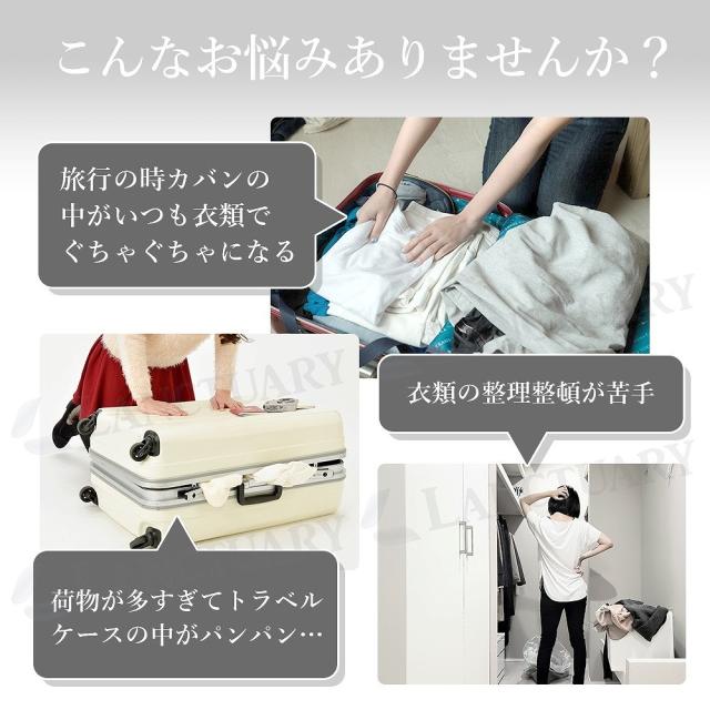 | 商品の説明 | 手放せなくなる魔法のバッグ!圧縮トラベルポーチ 軽量衣類用旅行バッグ2個セット。 旅行で大きな荷物を持ちたくない…そんなあなたに!衣類や日用品は全て1つのバッグにまとめて出かけられます! ・旅行時の「カバンの中がいつも衣類でぐちゃぐちゃになる。」「衣類の整理整頓が苦手。」などのお悩みを解決します。 ・ダブルジッパーのデザインは、衣類の量に応じてバッグの容量を調整でき、固定することもできます。 ・ヴィクトリアズ・シークレットやザ・ノース・フェイスのメーカーの生地を使用しており柔軟性があり軽量です。国の検査期間にも合格しニオイもなく安心して衣類を保管できます。 ・小型ながら大容量!圧縮することにより容量を40%カットできるので普段使いでも重宝します。 ・ジッパーは繰り返し開閉してもスムーズなまま。外出時でも持ち運びやすいデザインの持ち手。 ・丁寧な作りで男女兼用で使える。 |