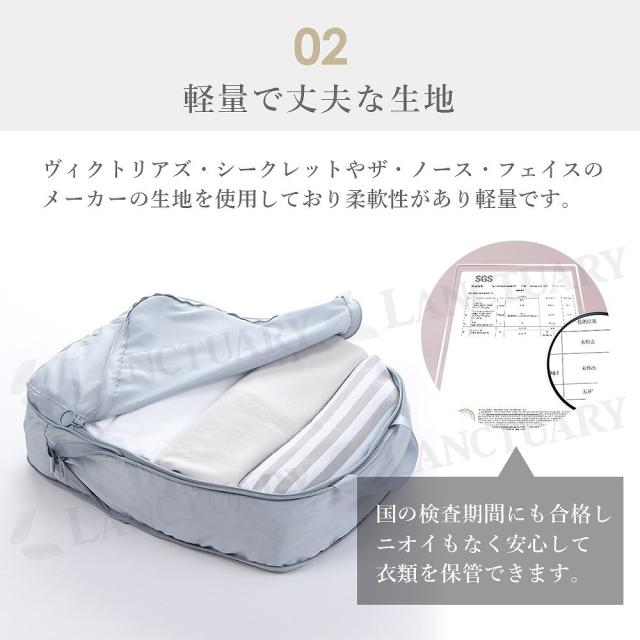 ・ヴィクトリアズ・シークレットやザ・ノース・フェイスのメーカーの生地を使用しており柔軟性があり軽量です。国の検査期間にも合格しニオイもなく安心して衣類を保管できます。