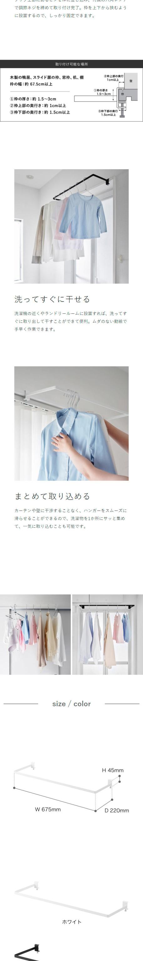 窓枠や鴨居に簡単設置 風通しよく部屋干し 『 tower( タワー )室内物干しハンガー 奥行きワイド 』は、部屋干しスペースが手軽に確保できるスチール製のハンガーバー。木製の鴨居や窓枠、室内ドアや浴室扉の枠などに、ピンとネジで簡単に固定できます。奥行き約22cmのワイドサイズで、引き戸やカーテンなどを閉めたままでも掛けた洗濯物が触れにくく、風通しよく干せるのが特長。洗面所やランドリールームに設置すれば、洗って干す作業もスムーズに。モノトーンのシンプルなデザインも魅力です。