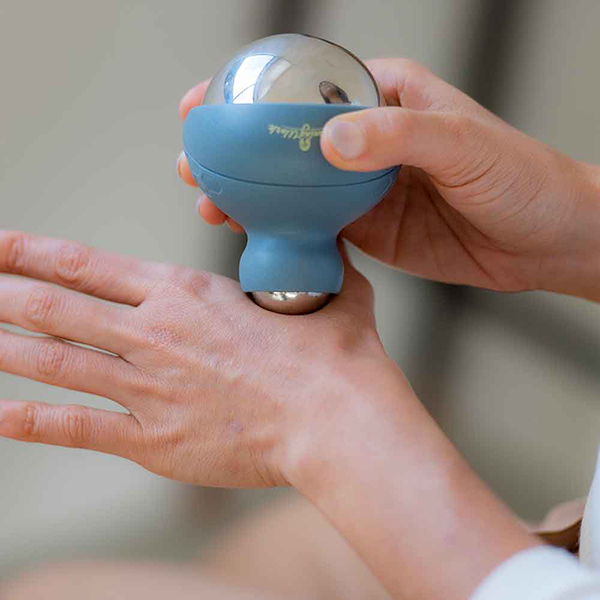 大小異なるサイズのボールを当てる部位で使い分け、電気を使わない、冷温機能2wayの使い方。保温を手助けするジェル内蔵ステンレス製ツインボールローラー。