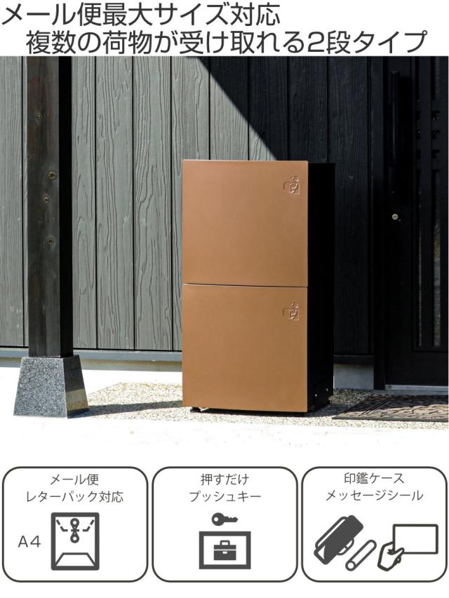 2段タイプの大容量宅配ボックスです。上下2段それぞれに鍵が付いているので、複数の荷物の受け取りが可能です。1段に収まらない荷物を2段に分けて収納したり、時間を分けて2回分の受け取りもできるので、宅配物が多いご家庭におすすめです。