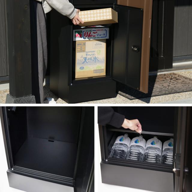 上部の投入口はメール便やA4サイズの受け取りが可能です。下部の投入口は市販の2Lペットボトル6本入が1ケース収納できます。