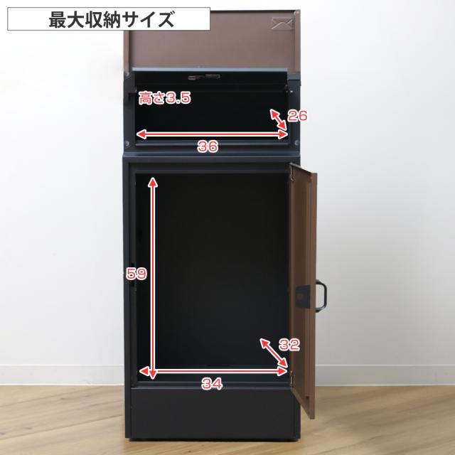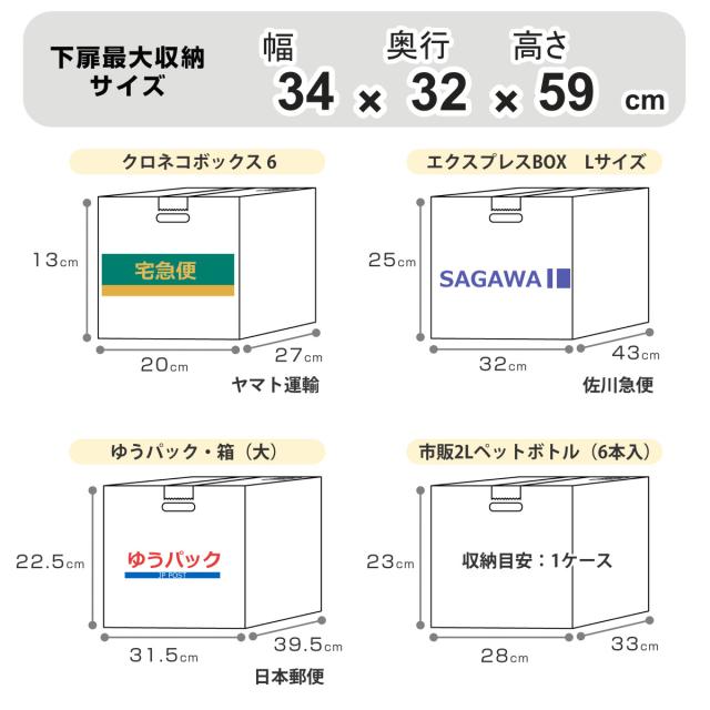 | 備考 | 【最大収納サイズ】 上段:約 幅36×奥行26×高さ3.5(cm) 下段:約 幅34×奥行32×高さ59(cm) 【宅配物最大重量】約20kg |