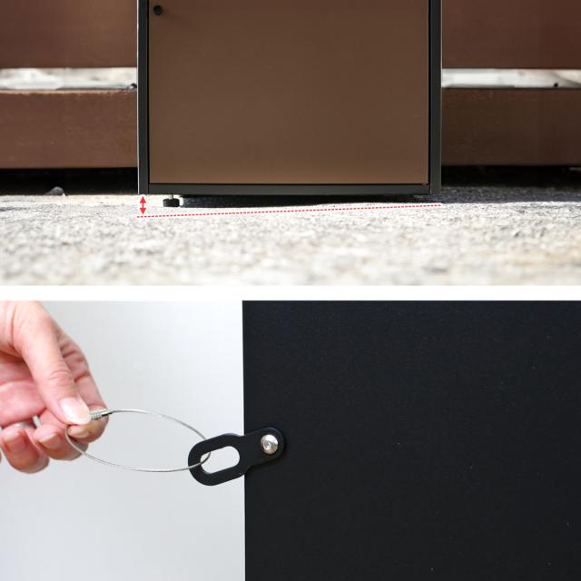 宅配ボックスの背面には盗難防止用金具が付いています。市販のワイヤーを通して固定できます。