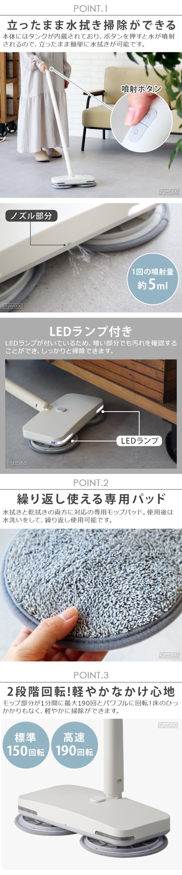 乾拭きはもちろん、本体にタンクが内蔵されており、水を噴射をしながら水拭きできる機能も搭載。噴射はグリップのボタンで操作可能です。モップ回転数は通常回転と高速回転の2モードから選べます。また、パイプの組み合わせで4種類の長さに調節可能。コードレスタイプでコンセントもないため、使用する場所も選びません。LEDランプが付いているため、暗い部分でも汚れを確認、拭き取ることができます。