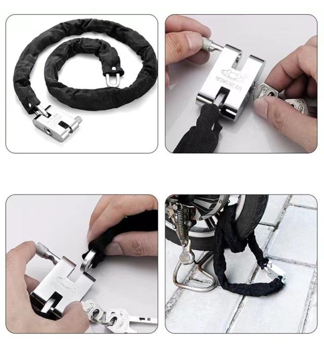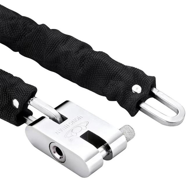 ◎鮮やかなナイロンカバーに高強度のチェーンが入るのが特徴です。車体にやさしいですが、盗難にきびしいです。見た目で泥棒を威圧することができます。