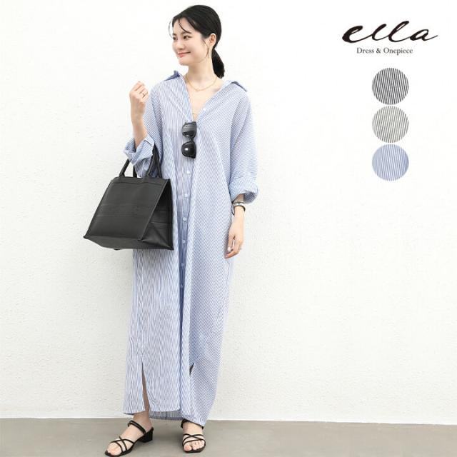 ストライプ柄 シャツワンピース ワンピース レディース ロング カジュアル 長袖 柄ワンピ 柄 縞 マキシ丈 マキシ丈ワンピ ふんわり ボリューム ゆったり 大人可愛い 羽織 抜き襟 スリット 綿 コットン かっこいい ブラック 黒 グレー 灰 ネイビー 紺 M L rt1232