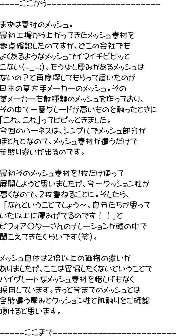 ハーネスの商品ページに熱い気持ちが記載
