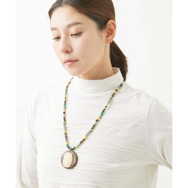 グリーンとイエローのビーズ、ウッドビーズを組み合わせた明るいネックレスです。トップには、リング型のパーツに古代柄を彫ったパーツを重ね、オリジナル性の高いアイテムに仕上げました。