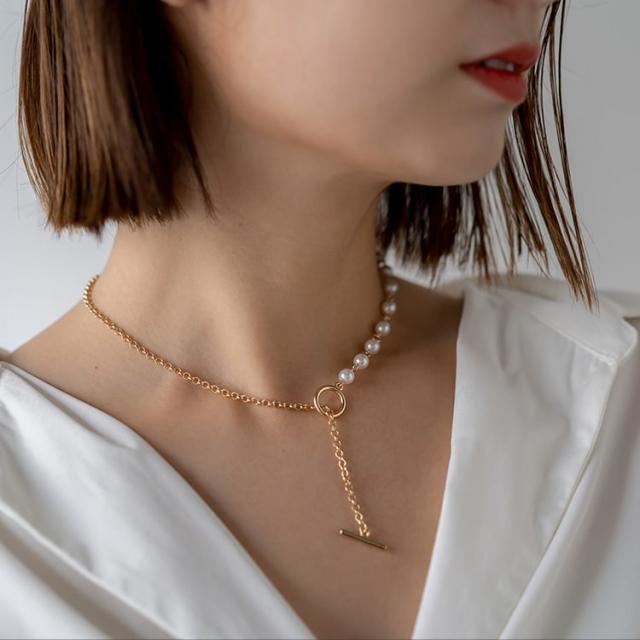 アズキチェーンにパールをあしらった、シンプルなマンテルネックレス。
