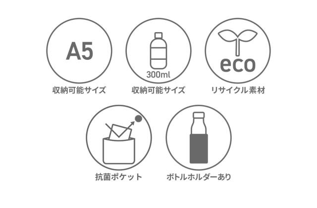 | 仕様 | <外側> ジップポケット(L)×1 ジップポケット(L)×1 └ 内蔵 ポケット(S)×1 <内側> メッシュジップポケット(L)×1 ポケット(M)×2 ボトルホルダー×1 <付属品> チャーム(お守り)×1 |