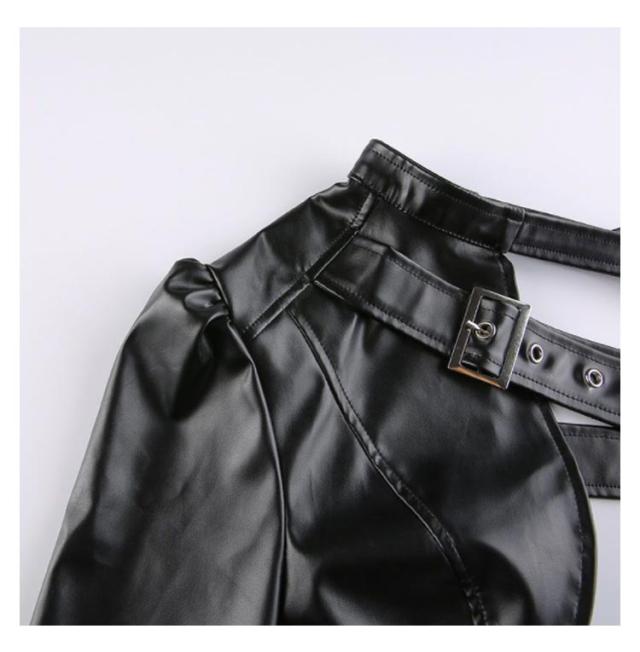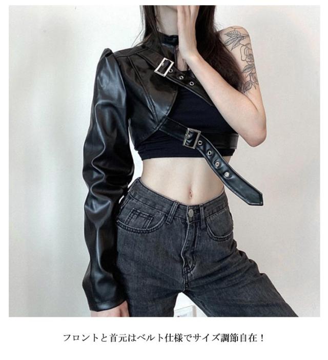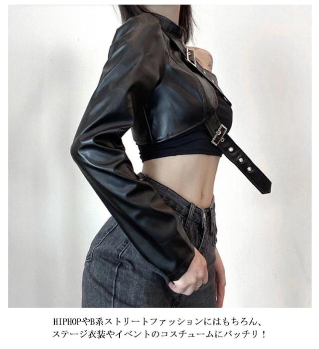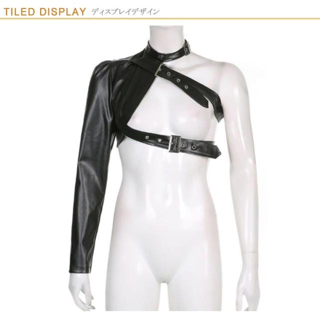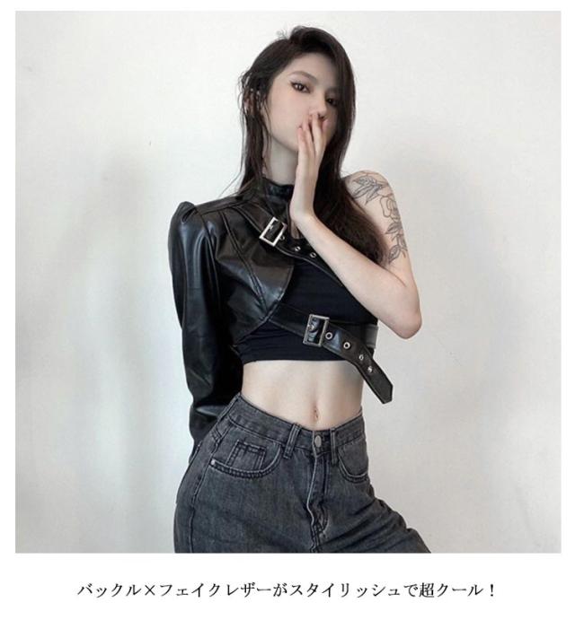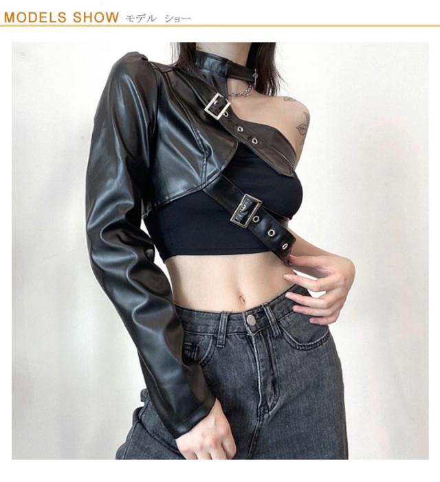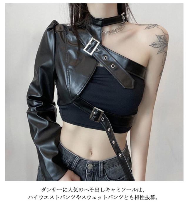 | S-L!ワンショルダーレザー調ジャケット。 バックル×フェイクレザーがスタイリッシュで超クール! フロントと首元はベルト仕様でサイズ調節自在! リアルレザーのように見えるよう安っぽくならない生地感にごだわったフェイクレザージャケットです。 ダンサーに人気のへそ出しキャミソールは、ハイウエストパンツやスウェットパンツとも相性抜群。 HIPHOPやB系ストリートファッションにはもちろん、ステージ衣装やイベントのコスチュームにバッチリ! | |