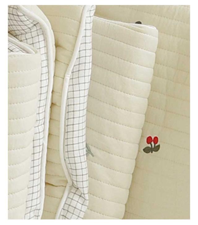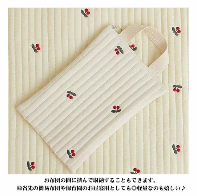 | 上質なコットンキルティング生地のお昼寝マット。 【コットンの優しい手ざわり】両面コットンのキルティング生地だから、赤ちゃんのお肌にやさしく、ふわふわなさわり心地です。 【しっかりした厚みのふかふかマット】高品質な綿をふんだんに使い、重厚感のあるふかふかな感触を実現しました。 【コンパクトにたためて持ち運びラクラク!】持ち手とスナップボタンが付いているので、コンパクトに畳んで持ち運べます。お布団の間に挟んで収納することもできます。帰省先の簡易布団や保育園のお昼寝用としても◎軽量なのも嬉しい♪ 【マットのたたみかた】柄面を下にして三つ折りに。さらに二つ折りしてスナップボタンでとめて完成。 【ナチュラルな刺繍デザイン】かわいい動物や植物の刺繍デザイが癒されるナチュラルマット。裏面もリバーシブルで使えるので、用途や気分に合わせて使い分けできます。お昼寝マットとしてはもちろん、プレイマットとしても◎移動先に持ち運べてさっと広げて遊ばせられます。 洗濯機で丸洗いできます。 | |