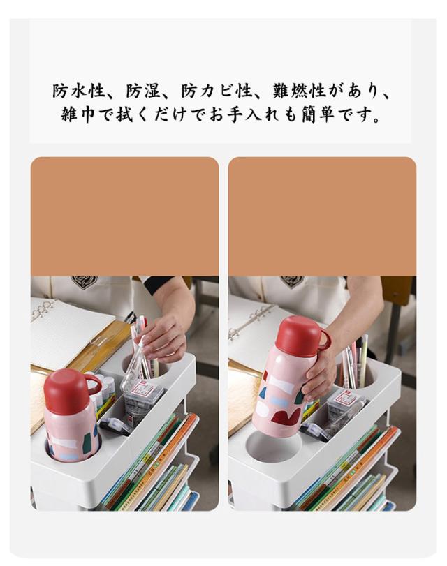 | キャスター付きで移動便利なデスクサイド収納ワゴン。 環境にやさしいプラスチックで作られており、非塗装、非毒性、安全で安心。防水性、防湿、防カビ性、難燃性があり、雑巾で拭くだけでお手入れも簡単です。 間仕切り設計された、書籍、雑誌、ノート、料理本、辞書、漫画本、フォルダ、文房具、テーブルパーツを一口にまとめて収納できます。 上トレイは小物を置くのに便利です。 キャスター付きなのでスムーズに移動ができます。 お掃除やお部屋の模様替えなどでの移動もスイスイ。 | |