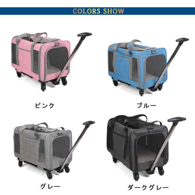 | 便利な3way仕様!旅行やお出かけ、歩くことが苦手なわんちゃんねこちゃんでも一緒に連れていけるキャリーカート トップと両サイドは通気性抜群のメッシュ素材 マナー袋やおやつ、小物の収納に便利な5つのポケット 折り畳み式のコンパクト収納設計 旅行もお出掛けもこれ1つで楽々!2WAYで使えるペットキャリーバッグ ショルダー部分は使う人やその時の状況に合わせて長さを調節できる。 ペット用防災グッズとしてもお使いいただけます。 耐久性に優れ、360度回転するキャスターを装備。楽々と転がせます。 | |