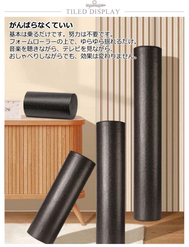 | 30 / 45 / 60 / 90cm 1日5分〜10分の簡単なストレッチで美しい体に! がんばらなくていい 基本は乗るだけです。努力は不要です。フォームローラーの上で、ゆらゆら揺れるだけ。音楽を聴きながら、テレビを見ながら、おしゃべりしながらでも、効果は変わりません。 誰でも、簡単に、一人でできる エクササイズには、筋力などの特別な運動能力は求められません。年配の方でも、バランス感覚に自信がなくても、まったく問題ありません。 耐久性 汚れや水に強いEPPを使用。耐久性が強く、お手入れも簡単。 | |