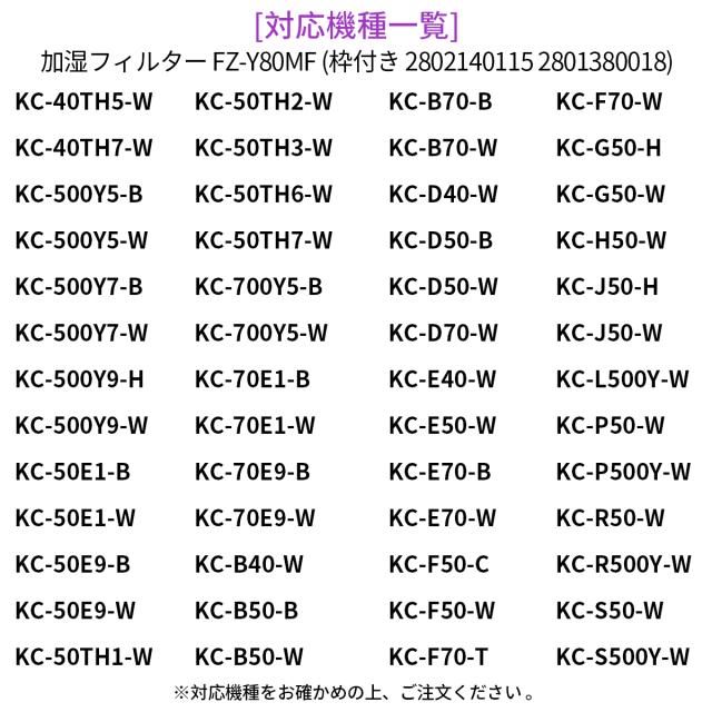 【改良バージョン】 枠ごとを交換することで、細菌の増殖を防ぎ、枠を拭く手間と時間が省け、交換を容易にする。 【コスパが高い】 従来の互換フィルター(枠なし)価格で、枠付き加湿フィルターFZ-Y80MFを購入することができ、より効率的な交換が可能に。 【交換便利】 現在ご使用中の加湿フィルターを枠と共に取り外し、本商品を直接取り付け、交換の手間を省き、瞬時に交換可能。 【機能】 防菌・防カビ、タンクやトレーのヌメリやニオイの原因となる菌を除菌します。 【交換の目安】 約1~2年(水質、使用環境によっては交換時期が早くなることがあります。) 【注意事項】 本品は消耗品です。使用環境によりフィルターの寿命が変化するため注意が必要。汚れが目立ち効果が落ちているようでしたら、速やかに交換することをおすすめいたします。 加湿フィルター fz-y80mf (枠付き 2802140115 2801380018) 対応機種一覧: KC-40TH5-W、KC-40TH7-W、KC-500Y5-B、KC-500Y5-W、KC-500Y7-B、KC-500Y7-W、KC-500Y9-H KC-500Y9-W、KC-50E1-B、KC-50E1-W、KC-50E9-B、KC-50E9-W、KC-50TH1-W、KC-50TH2-W、 KC-50TH3-W、KC-50TH6-W、KC-50TH7-W、KC-700Y5-B、KC-700Y5-W、KC-70E1-B、KC-70E1-W KC-70E9-B、KC-70E9-W、KC-B40-W、KC-B50-B、KC-B50-W、KC-B70-B、KC-B70-W、KC-D40-W KC-D50-B、KC-D50-W、KC-D70-W、KC-E40-W、KC-E50-W、KC-E70-B、KC-E70-W、KC-F50-C、KC-F50-W KC-F70-T、KC-F70-W、KC-G50-H、KC-G50-W、KC-H50-W、KC-J50-H、KC-J50-W、KC-L500Y-W、KC-P50-W KC-P500Y-W、KC-R50-W、KC-R500Y-W、KC-S50-W、KC-S500Y-W ※ご購入の前にご希望商品の対応機種一覧より、適合商品である事をご確認願います。 ※購入検討商品に関してご不明な点やご不安をお持ちのお客様は、ご購入前にお問い合わせください。 |
