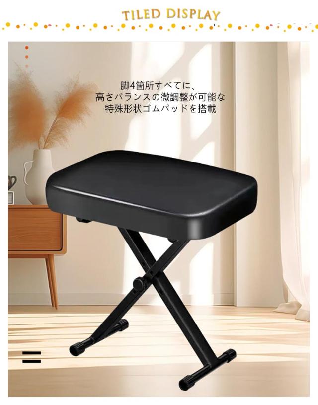 | ピアノ椅子 4段階調節 厚めのやわらかクッション 折りたたみ可能 脚4箇所すベてに、高さバランスの微調整が可能な特殊形状ゴムパッドを搭載 | |