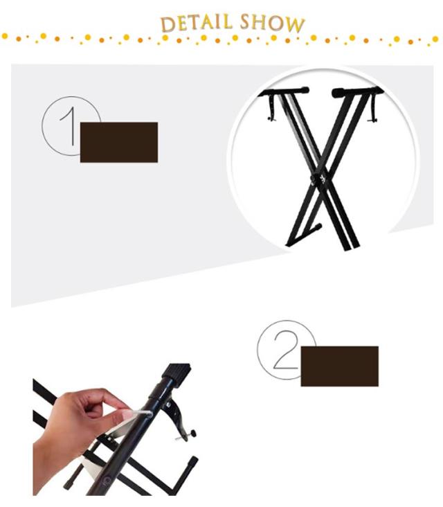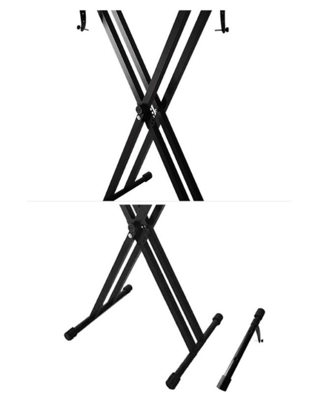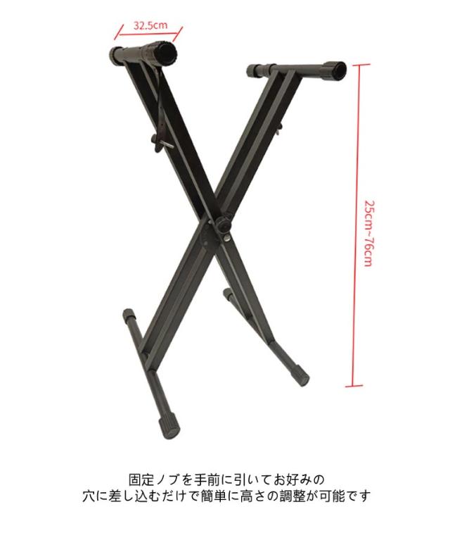 | 7段階調節 キーボードスタンド 場所を取らない折りたたみ式 電子ピアノに傷つくにくいコム付き 固定ノブを手前に引いてお好みの穴に差し込むだけで簡単に高さの調整が可能です | |