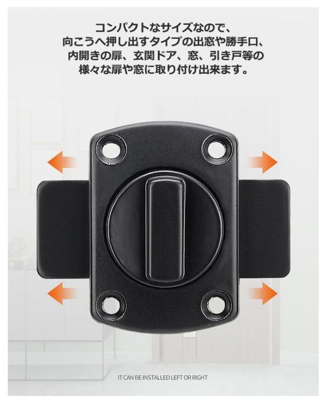 | 左側または右側に取り付けることができ、機構を作動させるために回転させ、閉じるために一方向に回転させる。 180度の滑らかな回転なので、開閉状態が切り替えやすいです。厚い素材のピッキング防止の設計は、泥棒を防ぐことができます。 コンパクトなサイズなので、向こうへ押し出すタイプの出窓や勝手口、内開きの扉、玄関ドア、窓、引き戸等の様々な扉や窓に取り付け出来ます。 工夫次第でいろいろなところに取り付けができる補助錠!ねじ止めをするので穴あけ加工が必要になりますが、強固に固定することができます。 施錠して鍵をはずしてしまえば、開けることは困難ですので防犯性をアップすることができます。 | |