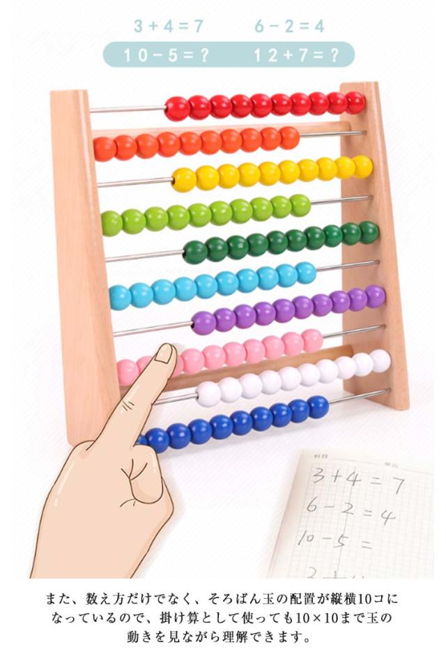 | 百玉そろばんです。 知育玩具の中で、シンプルでいて定番の人気商品です。 10本の棒を渡した木製のフレームにカラフルな10個のそろばん玉がついていて、数の数え方を覚えるのに役立ち、立てても寝かせても使える百玉そろばんです。 また、数え方だけでなく、そろばん玉の配置が縦横10コになっているので、掛け算として使っても10×10まで玉の動きを見ながら理解できます。 「ひとつ、ふたつ」を覚える頃から算数の基礎を習う頃まで使っていただけます。 | |