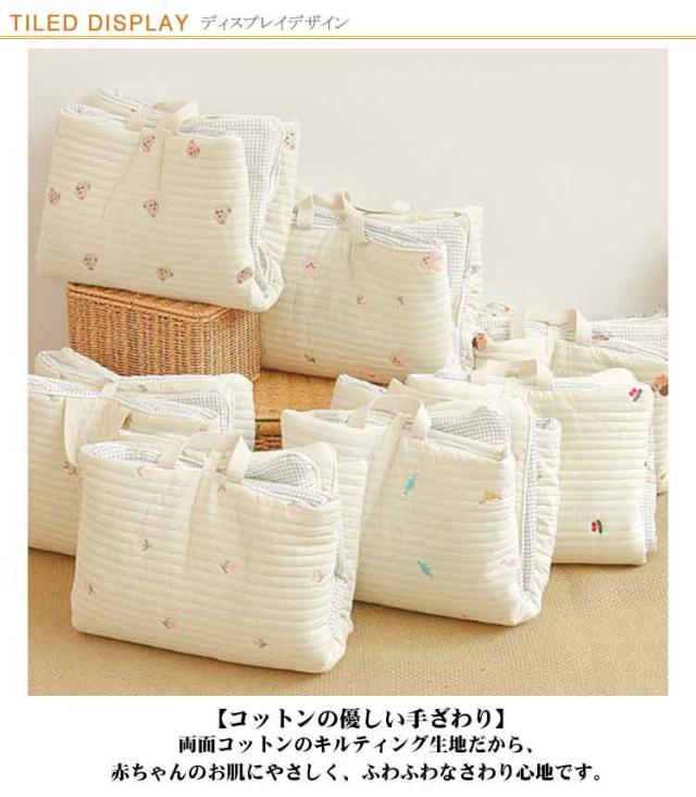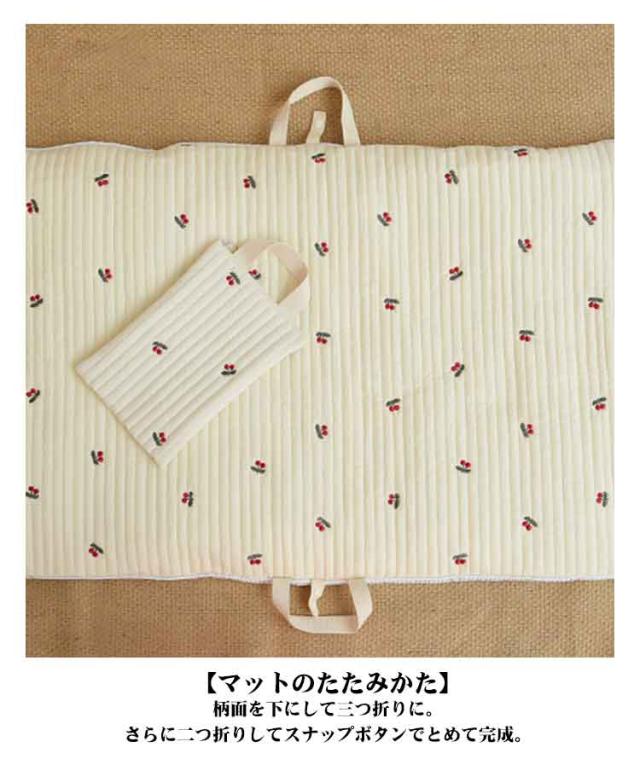 | 上質なコットンキルティング生地のお昼寝マット。 【コットンの優しい手ざわり】両面コットンのキルティング生地だから、赤ちゃんのお肌にやさしく、ふわふわなさわり心地です。 【しっかりした厚みのふかふかマット】高品質な綿をふんだんに使い、重厚感のあるふかふかな感触を実現しました。 【コンパクトにたためて持ち運びラクラク!】持ち手とスナップボタンが付いているので、コンパクトに畳んで持ち運べます。お布団の間に挟んで収納することもできます。帰省先の簡易布団や保育園のお昼寝用としても◎軽量なのも嬉しい♪ 【マットのたたみかた】柄面を下にして三つ折りに。さらに二つ折りしてスナップボタンでとめて完成。 【ナチュラルな刺繍デザイン】かわいい動物や植物の刺繍デザイが癒されるナチュラルマット。裏面もリバーシブルで使えるので、用途や気分に合わせて使い分けできます。お昼寝マットとしてはもちろん、プレイマットとしても◎移動先に持ち運べてさっと広げて遊ばせられます。 洗濯機で丸洗いできます。 | |