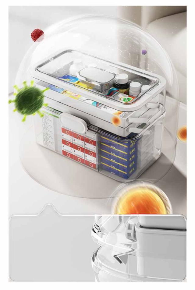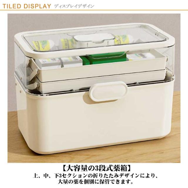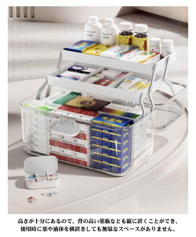 | 【大容量の3段式薬箱】上、中、下3セクションの折りたたみデザインにより、大量の薬を個別に保管できます。 高さが十分にあるので、背の高い薬瓶なども縦に置くことができ、使用時に薬や液体を横置きしても無駄なスペースがありません。 【見やすく取り出しやすい】透明な蓋なので、蓋を開けずに中の中身が確認できます。 3層のトレーと仕切りにより、薬などを明確に分類でき、どこにいても一目でわかります。 【安全性と実用性の両立】蓋は「安全ロック」設計を採用しており、子供の誤食や飲み込みを効果的に防止できます。 また、上に引き上げると蓋が開くので、中身が飛び出す心配もありません。 【使いやすい・安心安全】蓋は180度開けられ、波形ハンドルのデザインは使いやすいです。 開閉部は「上下開き」を採用し、お子様の誤食を効果的に防止します。 また、蓋がしっかり閉まるので、持ち上げたときに蓋が落ちてしまう心配もありません。 【多用途】薬品収納ボックス以外にも、工具、裁縫道具、化粧道具、釣り道具などの収納など、様々な用途にご使用いただけます。 本製品は薬品収納ボックスです。 薬本体は付属しません。 | |