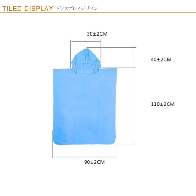 | お着替えタオルポンチョ。海水浴・プールの必需品! 柔らかく肌触りの良いマイクロファイバー素材を採用。速乾性と吸水性があり、水着やウェットスーツからの着替えの際には体を温めるバスタオル替わりとしてもお使いいただけます。 フード付きなので、日焼け防止になり濡れた髪を拭くこともできます。 袖下にスナップボタン付き、サイドにはスリットが入っているので、着脱がしやすく、移動の際も引っ掛かりにくい。 サーフィン・キャンプ・ダビング・プール・海水浴・スイミングスクール・ジム・ヨガ・サウナ・温泉・マラソン大会など様々なシーンで大活躍。 お部屋でバスローブとして、災害などの着替えでもご利用いただけます。 | |