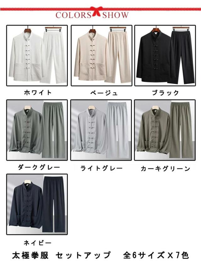 | 太極拳服 セットアップ 全6サイズx7色 太極拳や功夫武術の表演服、練習着に!! サラッとした着心地と肌触りの良い素材です。 パンツウエストにゴム入りとなってます。 | |