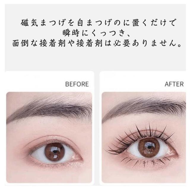 | わずか2秒で美しく自然なまつげを実現できます。 磁気まつげを自まつげのに置くだけで瞬時にくっつき、面倒な接着剤や接着剤は必要ありません。 磁石技術を採用し、高級人工繊維を使用し、接着剤なしで簡単にマグネットつけまつげを取り付けることができます。 まつげのボリュームアップさせながら、肌を傷めず、より重層的で立体的な目元を演出します。 | |