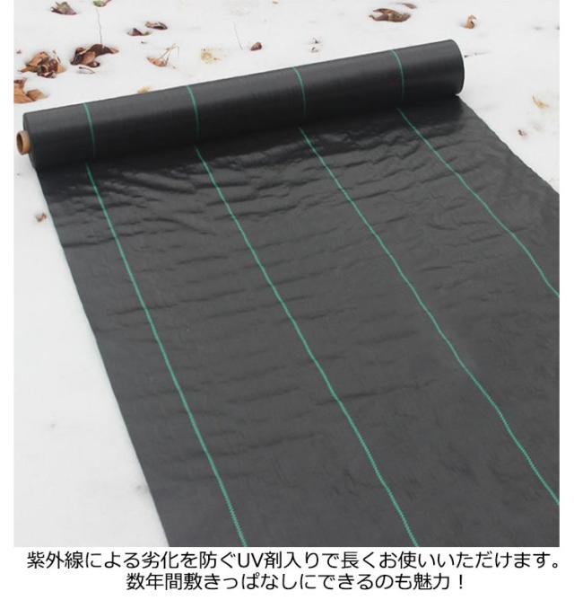 | 高密度・高透水性・耐用年数約7-12年 防草シート【長さ200m×幅0.5m】 広げて敷くだけで手間のかかる草取り作業から解放! 日光を遮断し雑草の光合成を抑える事で、何度抜いても生えてくる雑草を枯れさせて再発生を防ぐことができる防草シート。薬を使わないから、土を汚さず、人体や環境にも影響もありません。 紫外線による劣化を防ぐUV剤入りで長くお使いいただけます。数年間敷きっぱなしにできるのも魅力! 高密度雑草防止シート、カットしてもほつれしにくい。ラインが入っており、均等にカットできます。 田畑の雑草押さえや、菜園・ハウス内の通路、砂利や人工芝の下敷き等、様々な用途にご使用いただけます。 | |