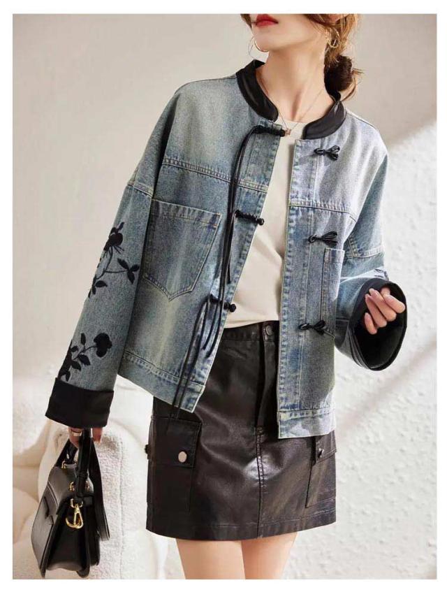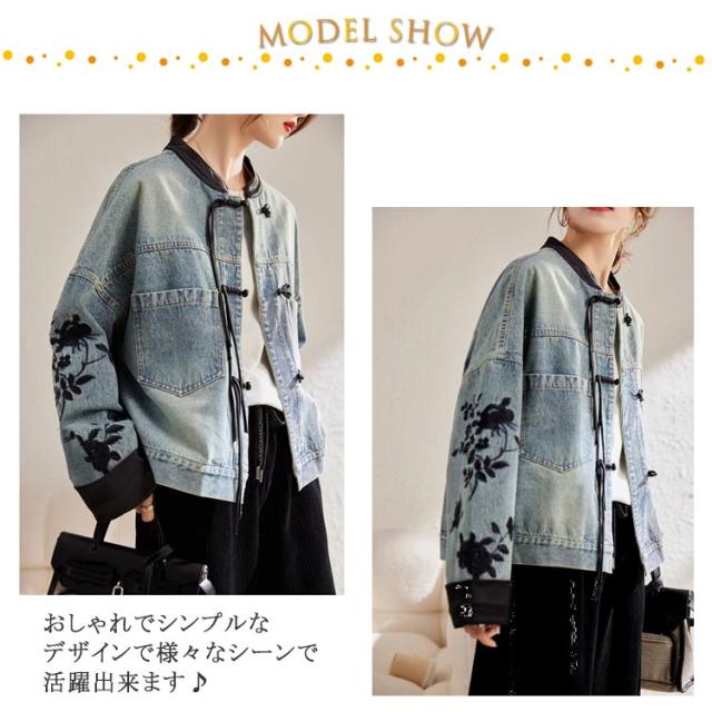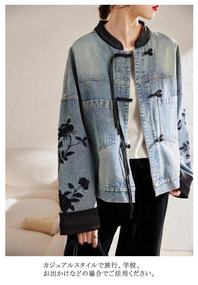 送料無料 チャイナボタン ノーカラー ジャンパー 刺繍 チャイナ風 デニム コート レディース ジージャン Gジャン デニムジャケット 長袖 羽織り ライトアウター 花柄 ゆったり カジュアル アウター オーバーサイズ 送料無料 トップス 春 夏