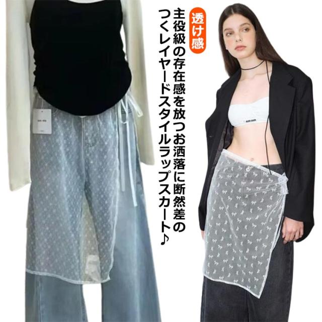 リボン柄 レーススカート レディース レイヤード チュール 刺繍 巻きスカート シアー ラップスカート チュール 膝上 透け シースルー 総レース ズボンの上 ボトムス 春 コーデ レーススカート チューリップ柄 雪柄 お洒落 ふんわり 重ね着 ゆったり 抜け感