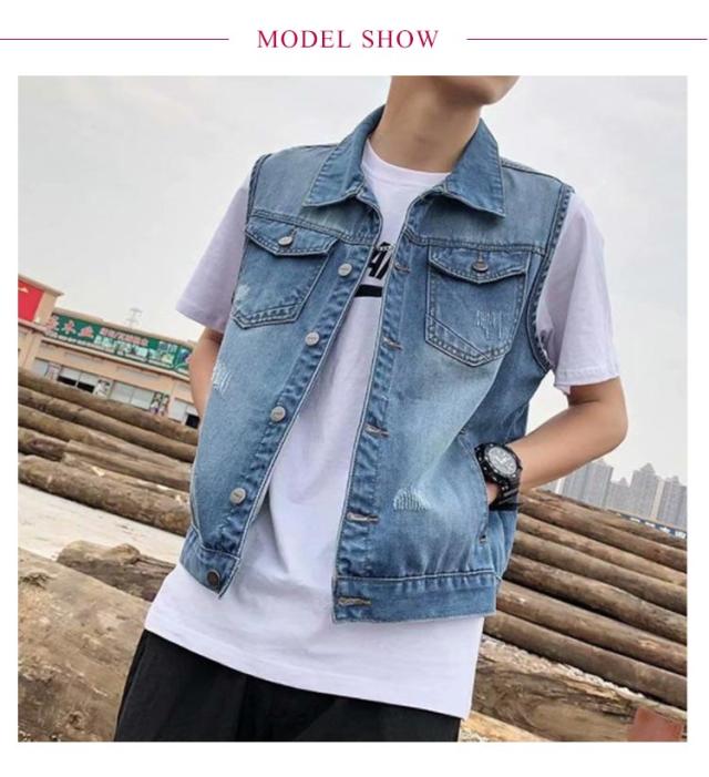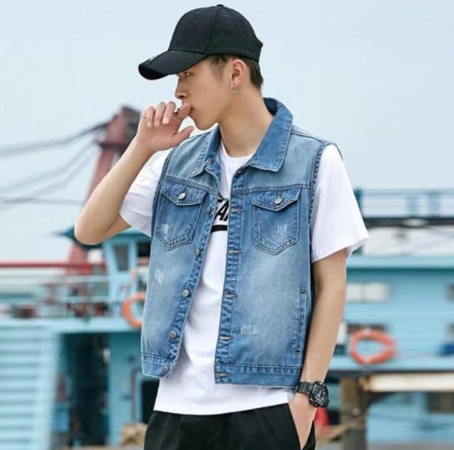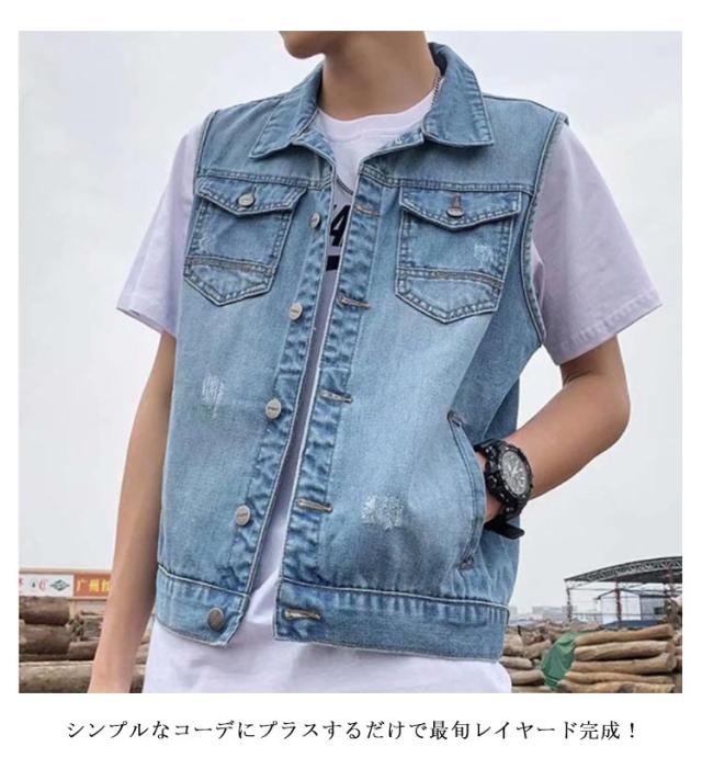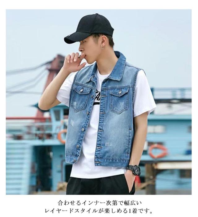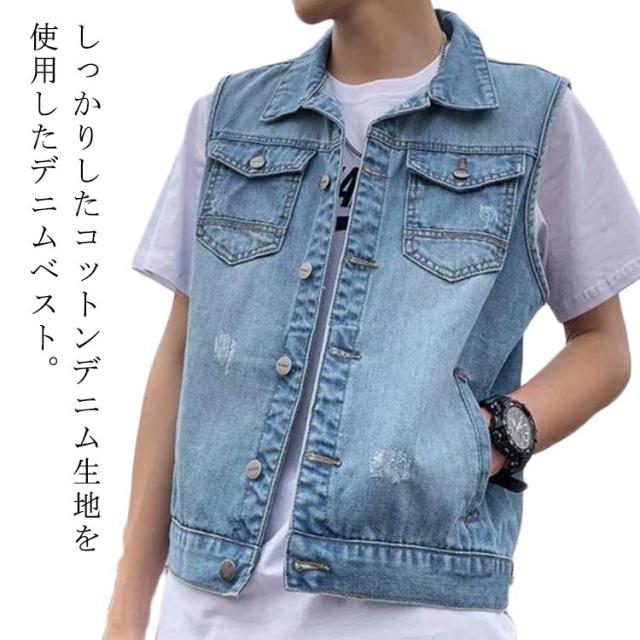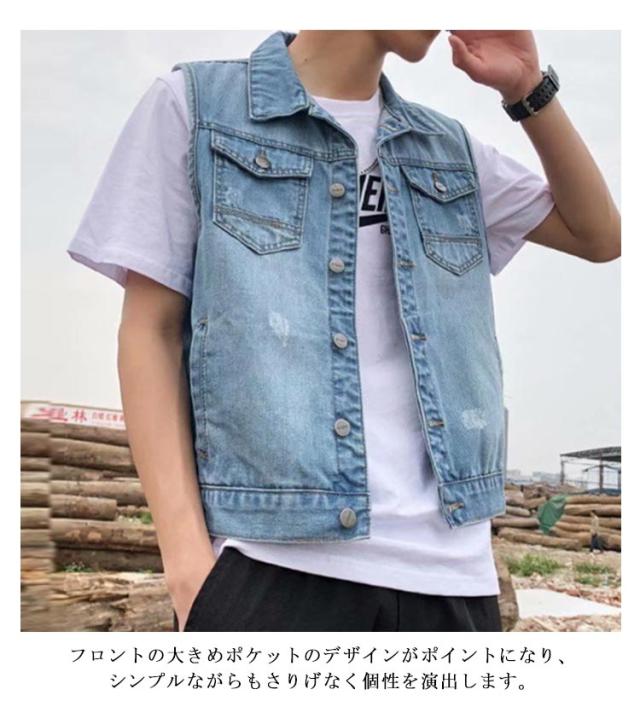 春 ジレ ベスト デニムベスト メンズ ショート丈 デニム ジャケット デニムジャケット ノースリーブ 秋 ダメージ加工 アウター 羽織り 重ね着 レイヤード デニム デニムベスト ライトアウター スリム ポケット付き 大人 カジュアル 大きいサイズ