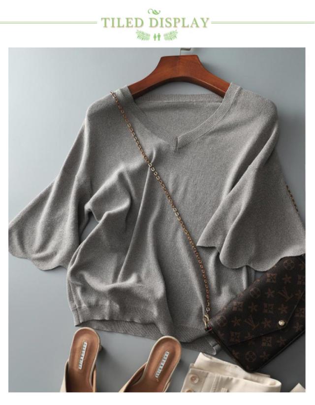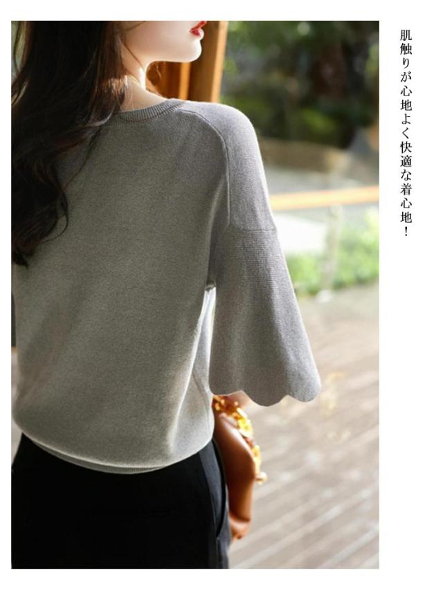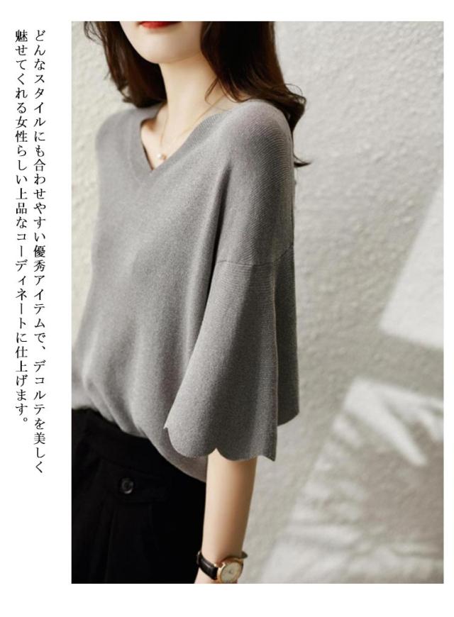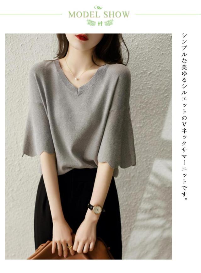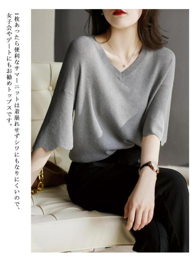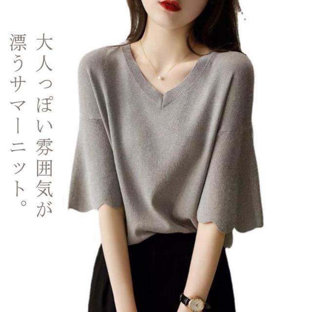 ニット レディース トップス 半袖 サマーニット Vネック 春 夏 五分袖 フリル UV 薄手 涼しい カットソー 無地 日常感 カジュアル シャツ お出かけ 作 着痩せ シンプル 美シルエット きれいめ 20代 30代 40代