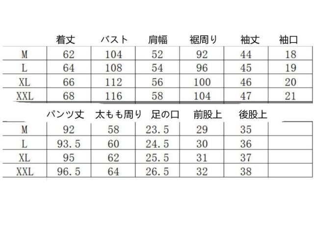 | サイズについての説明 | M L XL 2XL サイズ:写真通り ※上記サイズは平置き実寸になります。サイズ表の実寸法は商品によって1-3cm程度の誤差がある場合がございます。麻?上?尺?表,【尺? 衣? 胸? 肩? 下? 袖? 袖口】改?【トップス 着丈 バスト 肩幅 裾 袖丈 袖口】,【尺? ?? 腿? ?口】改?【パンツ 着丈 太もも 裾】,其他不上? |