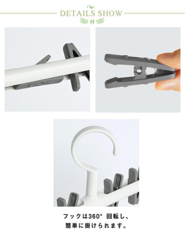 | ちょこっとした洗濯物を干すのにとっても便利なピンチハンガー。 フックは360°回転し、簡単に掛けられます。 シンプルなデザインなので、室内干しにもおすすめです。 ピンチはしっかりしていて、 挟む力抜群!落下防止も! | |