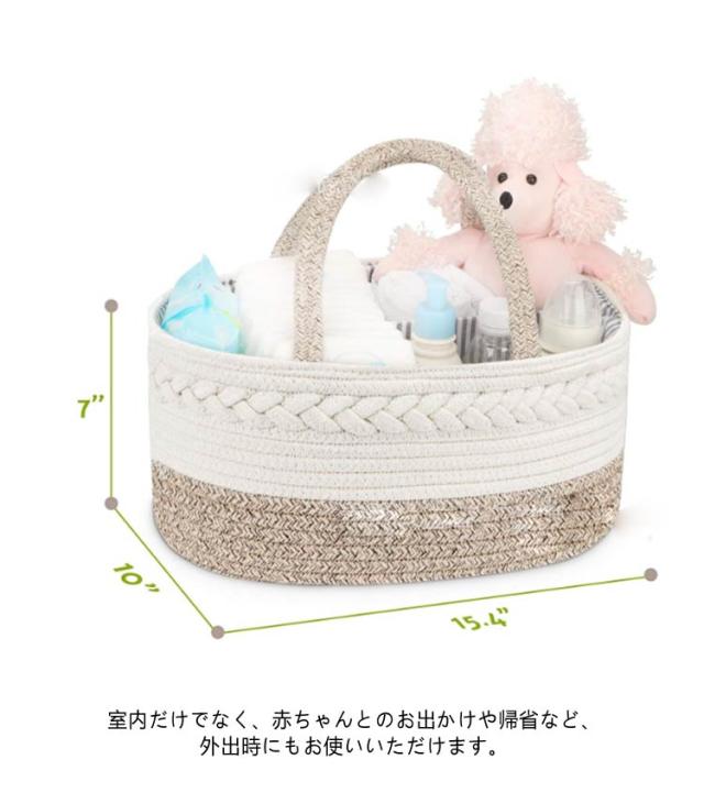 | 【オムツストッカー】【仕切り付き】【大容量】【ロープ編み】 しっかりと編まれたコットンロープで作っているため形が崩れにくく、ママにも大好評です! おむつ以外にも哺乳瓶・綿棒・着替え・おもちゃ・おむつゴミ袋・おしり拭き・ガーゼ・タオル・ベビークリーム・ハンドクリームなどたっぷり収納できます。 中に取り外し可能な仕切りが付いており、ベビーグッズを整理して収納することができます。 室内だけでなく、赤ちゃんとのお出かけや帰省など、外出時にもお使いいただけます。 | |