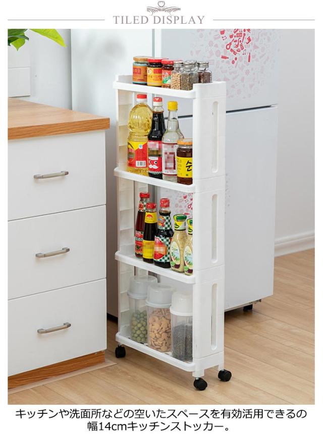 | 幅わずか13.8cmでもたっぷり収納!隙間を有効活用 3段 4段 キッチンや洗面所などの空いたスペースを有効活用できるの幅14cmキッチンストッカー シンプルなデザインなので、キッチンはもちろんランドリーなど場所を選ばずお使い頂けます。 プラスチック製なので軽くて簡単に移動ができ、水周りでも安心です。 食器棚や洗濯機の横、冷蔵庫とシンクの隙間などのちょっとしたスペースにピッタリです。 ストッカーは水やカビ・汚れに強く、水に濡れてもサッと拭き取れるのでキッチンや洗面所などの水周りでの使用に最適です。 | |