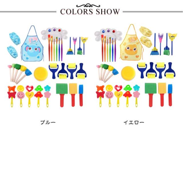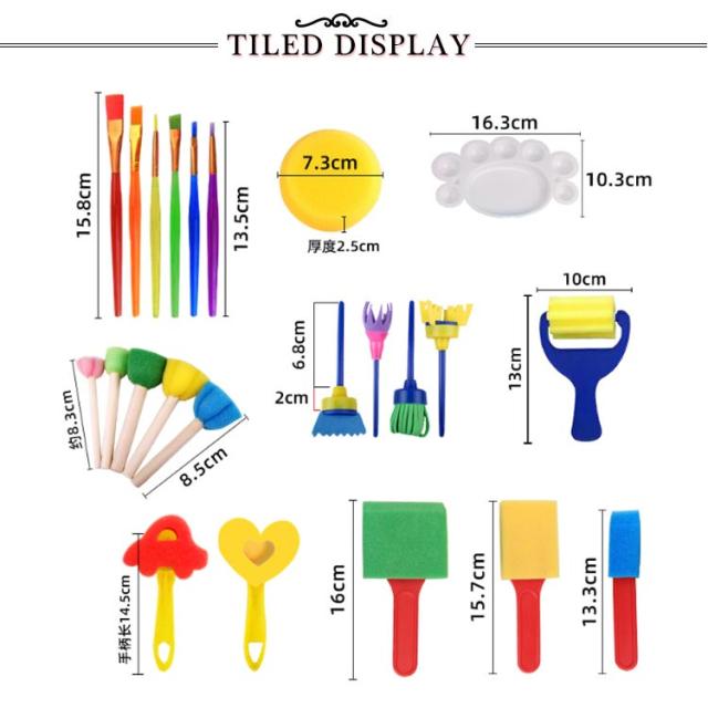 | サイズについての説明 | サイズ:27*22cm ※絵具は別売 セット内容:ローラーブラシ×4本、フラワーブラシ×4本、スタンプブラシ×4本、丸のスポンジブラシ×4本、方形のスポンジブラシ×2本、ペイントブラシ×6本、パレット×2個、子供用エプロン×1枚 |