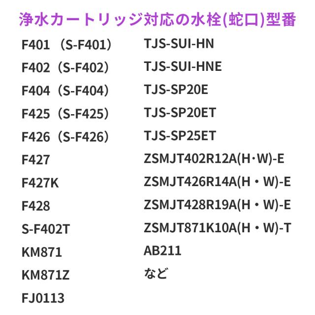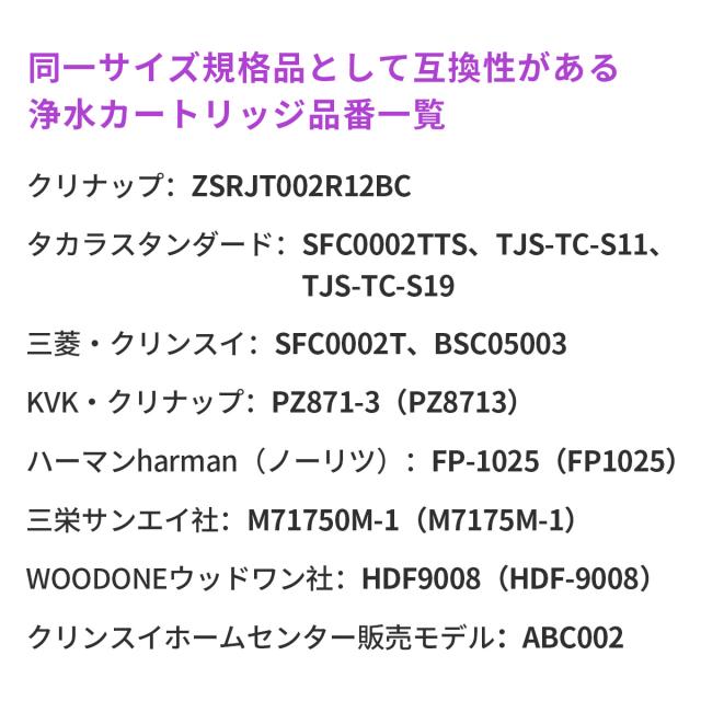 | F401 (S-F401)、F402(S-F402)、F404(S-F404)、F425(S-F425)、F425K、F425BS、F425KBS、F426(S-F426)、F426K、F427、F427K、F428、F428K、F428BS、F428KBS、S-F402T、ZSMJT402R12A(H・W)-E、ZSMJT426R14A(H・W)-E、ZSMJT428R19A(H・W)-E、ZSMJT871K10A(H・W)-T、TJS-SUI-HN、TJS-SUI-HNE、TJS-SP20E、TJS-SP20ET、TJS-SP25ET、KM871、KM871Z、FJ0113、AB211 等 同一サイズ規格品として互換性がある浄水カートリッジ品番一覧: クリナップ:ZSRJT002R12BC、ZSRJT173R21AC タカラスタンダード:SFC0002TTS、TJS-TC-S11、TJS-TC-S19 三菱・クリンスイ:SFC0002T、BSC05003 KVK・クリナップ:PZ871-3(PZ8713) ハーマンharman(ノーリツ):FP-1025(FP1025) 三栄サンエイ社:M71750M-1(M7175M-1) WOODONEウッドワン社:HDF9008(HDF-9008) クリンスイホームセンター販売モデル:ABC002 ※購入検討商品に関してご不明な点やご不安をお持ちのお客様は、ご購入前にお問い合わせください。 |