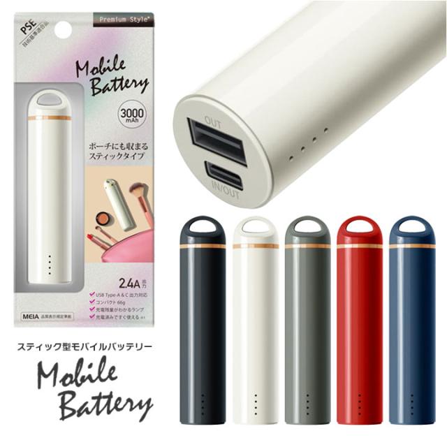 スティック型モバイルバッテリー 3000mAh 軽量 コンパクト USB type-A Type-C 2台同時充電 ストラップホール付 ブラック アイボリー グレー レッド ネイビー メール便送料無料