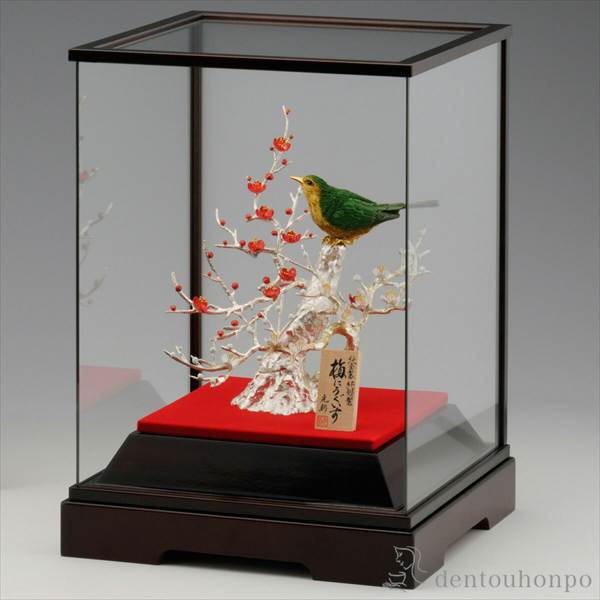 美しい彩色が施された、純金(K24)の鶯(うぐいす)の置物です。梅は純銀で表現されています。