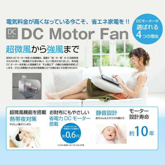 30cmリビング扇風機。DCモーター扇風機。フルリモコン。収納式リモコンでスッキリ。超微風機能でやさしい風。フルリモコン。DCモーター。ソフトタッチ風量6段階切替。7.5時間入タイマー。切タイマー。リズム風。おやすみ風。首振り。風量切替。高さ調節。静音。フラットガード。