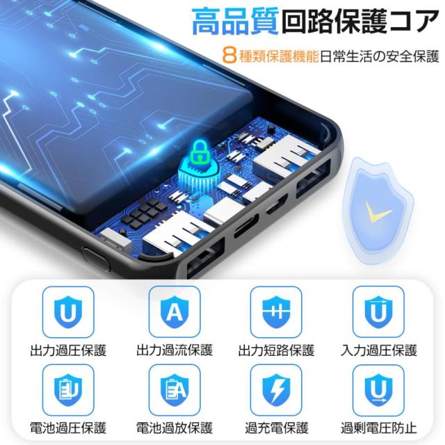高性能ICチップと安全装置が内臓されており、モバイルバッテリーが過充電・過放電・過熱・ショートの際に、自動的に充電を停止してくれますので、安心して使うことができます。