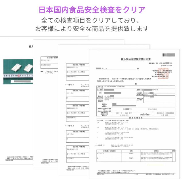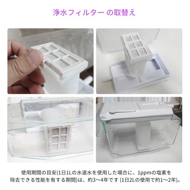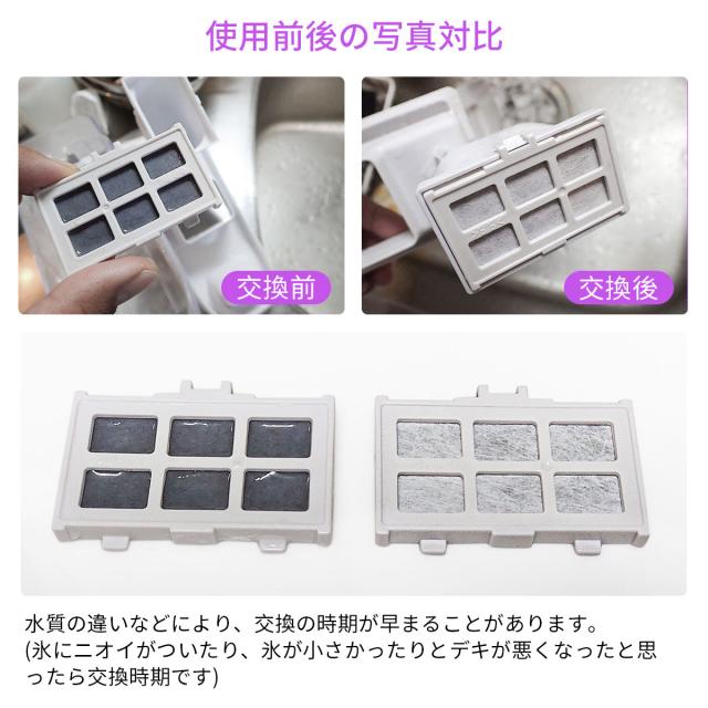 ● 商品重量で50gで商品の寸法は奥行き7mm、幅35mm、高さ61mmです。 ● 浄水フィルターは定期的にお取替えください。使用期間の目安(1日1Lの水道水を使用した場合に、1ppmの塩素を除去できる性能を有する期間)は、約3〜4年です (1日2Lの使用で約1〜2年)。 ● 水質の違いなどにより、交換の時期が早まることがあります。(氷にニオイがついたり、氷が小さかったりとデキが悪くなったと思ったら交換時期です) ● 便利な機能である自動製氷機ですが、給水タンクや浄水フィルターのお手入れは一週間に一回以上行ってください。また、水道水での製氷をおすすめします。水道水以外で製氷している場合は雑菌が繁殖しやすくなるため、3日に一回以上の頻度が目安です。お手入れの手順はお使いの冷蔵庫の取扱説明書でご確認ください。 |