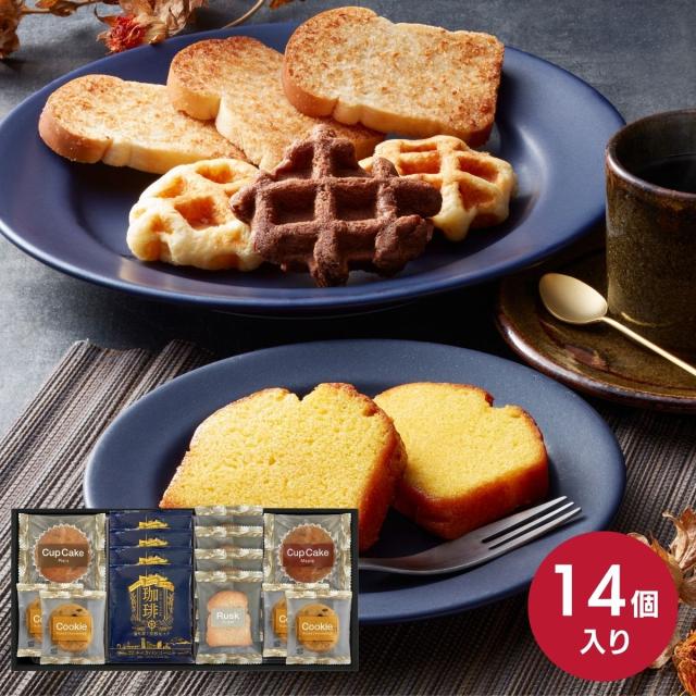 1928年創業の創業以来変わらぬ「確かな技術」と「美しさへのこだわり」が誇りのキャラバンコーヒーと、甘さを抑え、軽い食感に仕上げた馴染みのあるシュガーラスク、香ばしいココナッツの風味が広がるさくっとした軽い食感のココナッツラスク、バニラ風味のプレーンケーキにメープルの風味が食欲をそそるメープルケーキ、ベルギー産の粒状砂糖「パールシュガー」を加え、食感にアクセントをつけた、程よい甘さのプレーンワッフル、やわらかな生地に、カリカリとした食感がアクセントのチョコレート風味のチョコワッフル、爽やかな甘さの風味が心地よいレモンの香りが活きるアーモンド風味のレモンケーキなどの詰め合わせです。