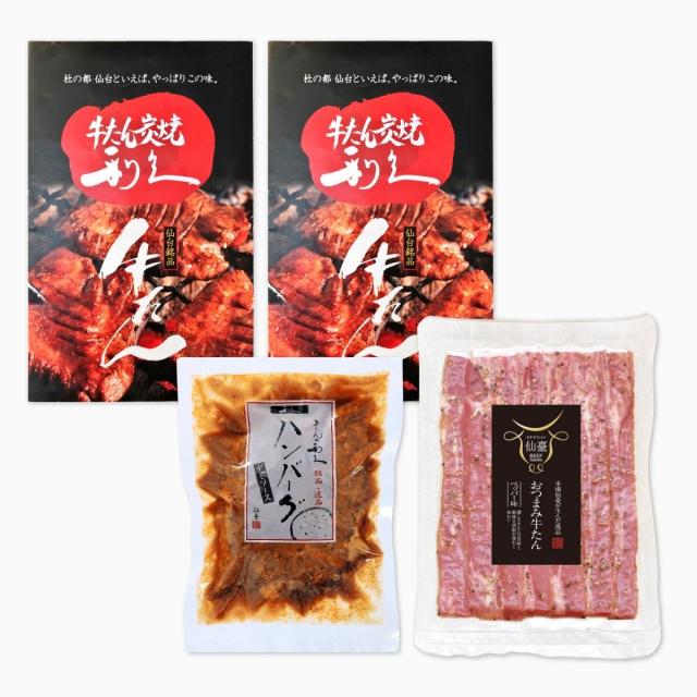 厚切り塩味の牛たんと食べ応えたっぷりの牛たんハンバーグ、解凍してすぐ食べられるおつまみ牛たんをセット
