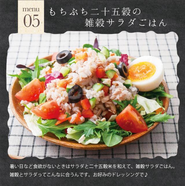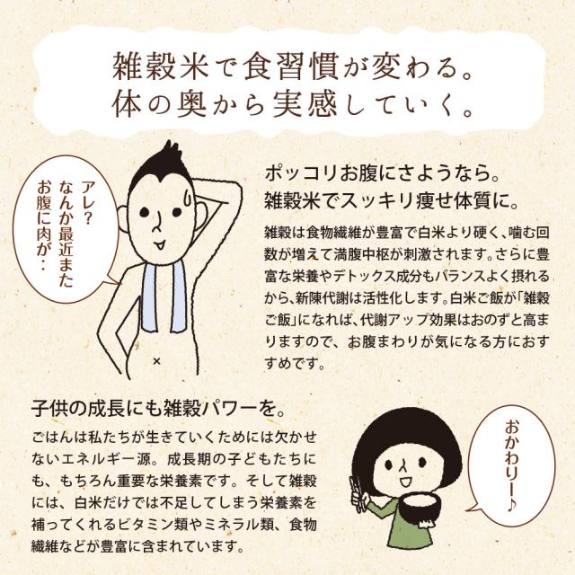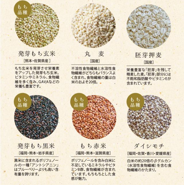 もち麦(福岡・佐賀・熊本)、発芽もち玄米(熊本・佐賀)、丸麦(国産)、胚芽押麦(国産)、発芽もち黒米(福岡・熊本・岩手)、もち赤米(福岡、熊本、滋賀)、ダイシチモチ(福岡・佐賀・香川・愛媛)、えごま(岩手)、青肌玄米(熊本)、発芽玄米(熊本)、焙煎挽割大豆(熊本)、黒千石豆(北海道)、はと麦(国産)、もちきび(北海道・岩手)、挽割青大豆(宮城・新潟)、アマランサス(岩手)、たかきび(岩手・秋田)、ひえ(岩手・北海道)、緑米(熊本・福岡)、もちあわ(岩手・北海道)、挽割とうもろこし(北海道)、ひき割り黒大豆(北海道・熊本)、うるちあわ(長崎)、挽割小豆(北海道)、挽割手亡(白豆)(北海道)