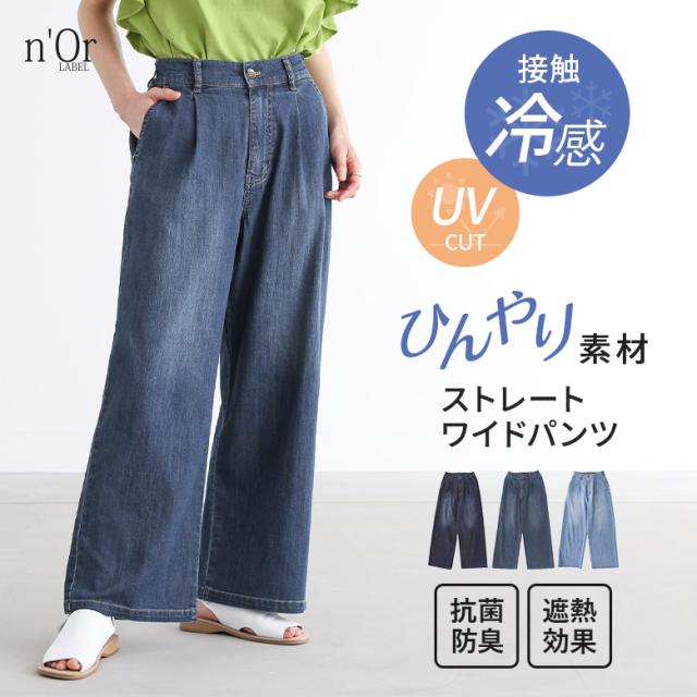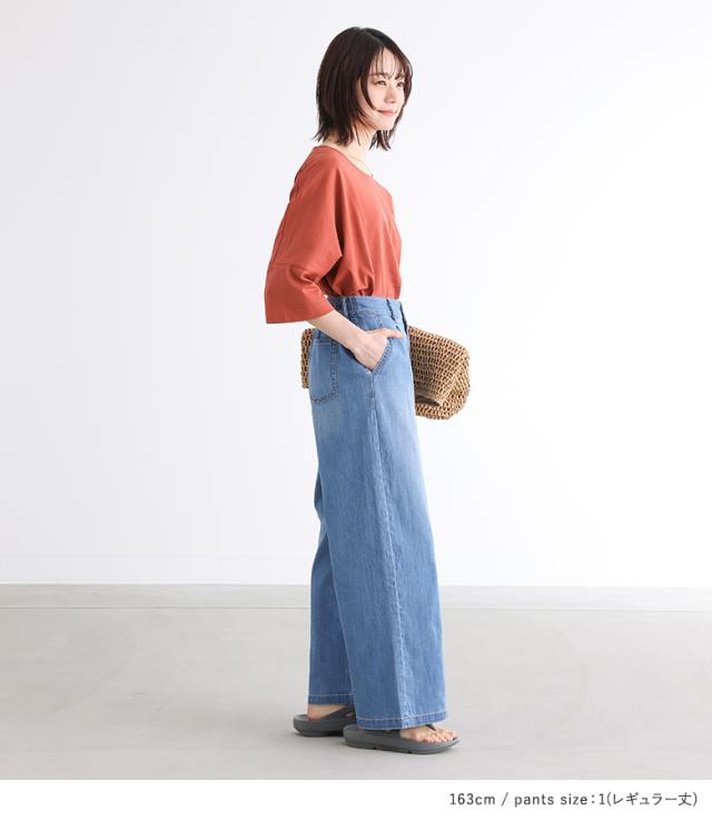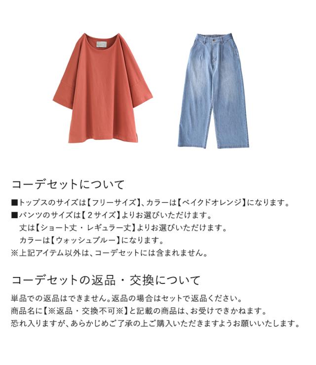 『UネックTシャツ×ワイドストレートデニムパンツコーデ2点SET』【メール便不可】【20】[2点コーデセット 2024 レディース Tシャツ 五分袖 七分袖 汗じみ防止 ボトムス デニム ロング 冷感]